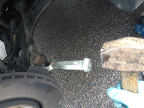 7Dii_IMG_1458Take the nut off, and using a ball splitter, and in my case, a little persuader in the form of a 4lb club hammer (right) pry the bolt out of the hub carrier.