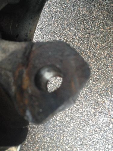 Right: You can clearly see the end of the transverse link arm is bent out to the right more than the left. Note: I’ve not put the replacement bush in at the top yet.
