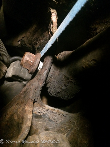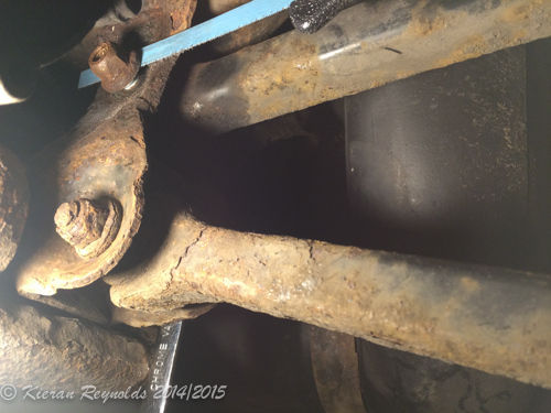 7Dii_IMG_3140Right and below: So up steps Mr H. acksaw and after giving me a sore arm and shoulder some time later, as well as “excuse” to blurt out a few choice words during – the bolt 7Dii_IMG_3145is cut to release the seized on nut, and I can start think about removing the bolt from the transverse arm and subframe.