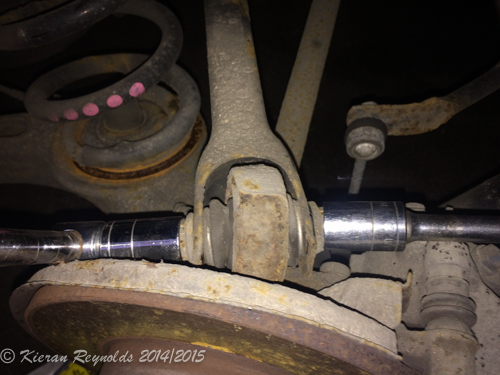 As you can see from the shot to the right, the top transverse arm bolt looks awfully close to the subframe to chassis bolt, and it could be down to luck and a following wind that allows the transverse link nut to be removed without doing anything to the subframe nut….