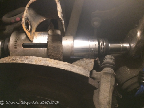 Next thread the bolt part through the hub-carrier, and fit the supplied new nut on the end, and tighten to the correct torque (look it up – I’ve forgotten!)
