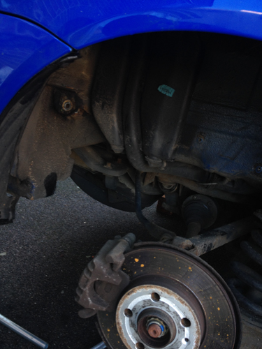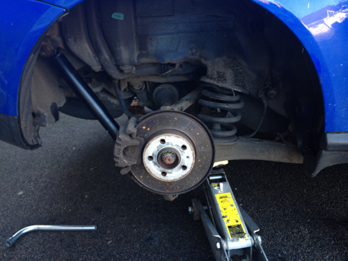 First off – standard jack car up, wheel off, and then support the car with axle stand at the rear jacking point.