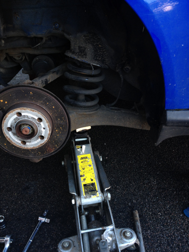 Right: Car on axle stands (out of shot), and trailing arm supported by trolley jack. Look closely and you can see the block of wood under the trailing arm.