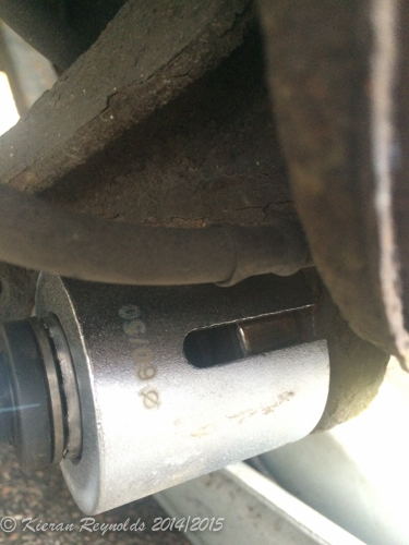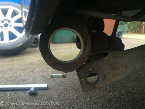 Right: New bush nicely sitting in it’s new home, ready to have the bottom transverse link re-attached. Note the clear gap between where the bar U is – and where the bush is.