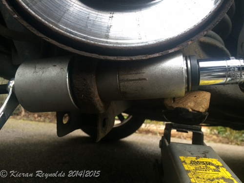 Once this bolt was taken out, I did decide to take the caliper off, and to prevent it hanging on the flexible (and damagable) brake line, used a bungy cord to hold it a little out of the way, but prevent any undue stress in the brake line.