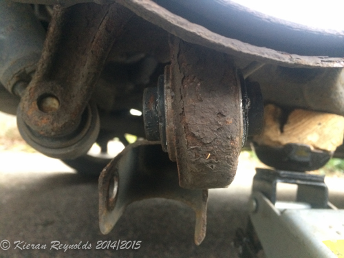 What is noticeable in the shot above right, is that the transverse arm is no where near centred on the hub carrier – it’s way off to the left – and that is part of the problem – the bush that is supposed to keep it centred it has failed.